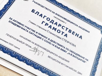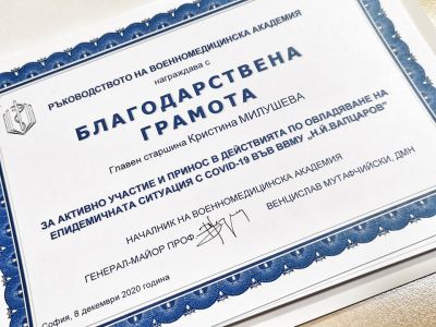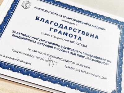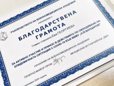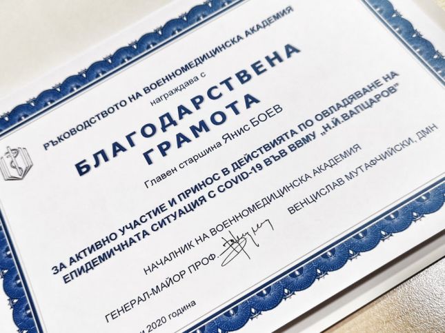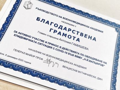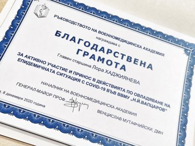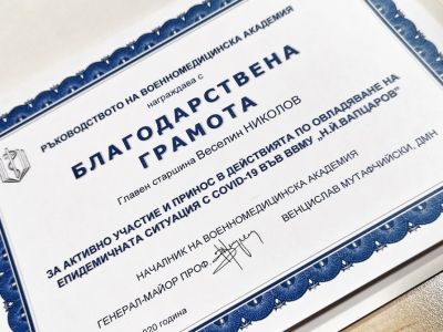 Началникът на ВМА генерал-майор проф. д-р Венцислав Мутафчийски награди бъдещите военни лекари с благодарствени грамоти за активното им участие и принос в действията по овладяване на епидемичната ситуация с COVID-19 във ВВМУ "Н. Й. Вапцаров".