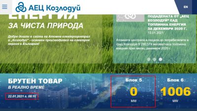 На 22.01.2021 г. в 1 часа и 16 мин. пети блок на АЕЦ „Козлодуй” бе изключен от енергийната система на страната след задействане на аварийната защита на реактора. Всички системи на блока са сработили съгласно проектните алгоритми.