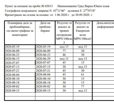 Резултати от лятото на 2020 г. от мониторинга на морските води на плаж Аспарухово