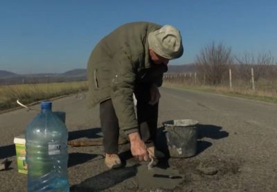 Снимките на бай Георги, който запълва дупките на пътя сам, в социалните мрежи публикувал Христо Наумов. Мъжът сподели, че спрял, за да го поздрави за начинанието.