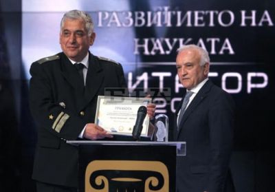 Началникът на ВВМУ – флотилен адмирал проф. д.в.н. Боян Медникаров, получи наградата за научен колектив с резултати в полза на обществото от председателя на журито проф. Костадин Костадинов.