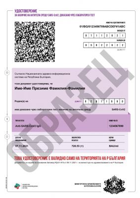 За да получите удостоверението за наличие на антитела, стойностите на антителата срещу SARS-CoV-2 трябва да са доказани чрез количествено изследване на Anti-SARS-CoV2 IgG и да надхвърлят 150 BAU/ml.