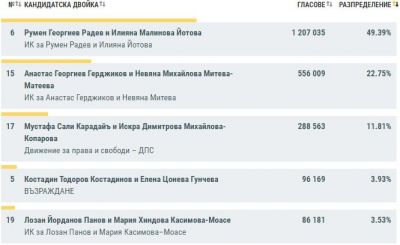 "Продължаваме промяната" държат първото място с 25.46%, а двойката Румен Радев - Илияна Йотова е с резултат 49.39%.