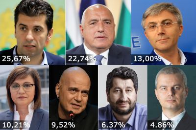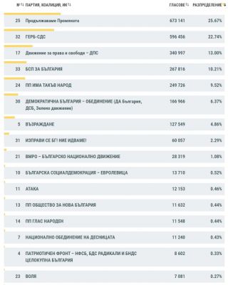"Продължаваме промяната" е първа политическа сила с 25,67% при 100% обработени протоколи от секционните избирателни комисии, сочи справка на Moreto.net в обявените междинни резултати от ЦИК.