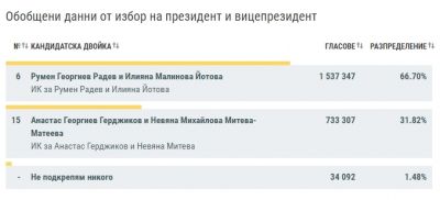 Румен Радев и Илияна Йотова печелят президентските избори показват данните при 99.82% обработени протоколи на секционните комисии. Двойката Радев и Йотова получават 66.70% подкрепа. За Анастас Герджиков и Невяна Митева са гласували 31.82%.