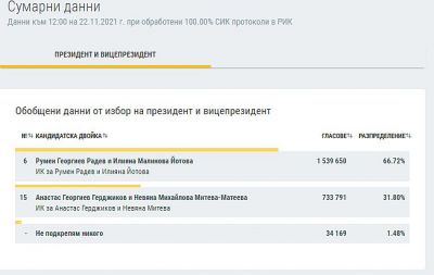 Румен Радев печели президентските избори на балотажа с 66,72% или 1 539 650 гласа