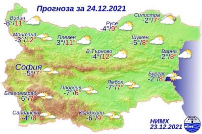 През нощта облачността, предимно средна и висока, ще е значителна. Ще духа слаб до умерен вятър от юг-югозапад. Минималните температури ще са между минус 7° и минус 2°, в София – минус 5°.