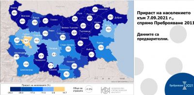Във всички останали области е регистрирано намаление, като най-малко е то за областите Пловдив (8.3%), Варна и София, съответно по 10.0%. Най-голямо намаление на броя на населението е регистрирано в областите Добрич и Видин - по 26.3%, и Монтана - с 24.2%.