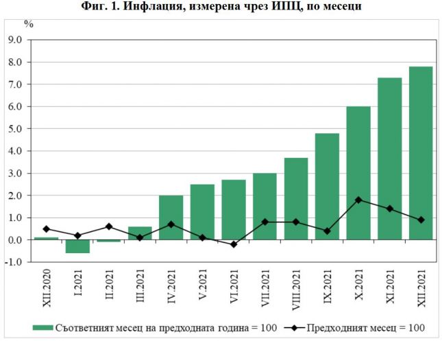 Индексът на потребителските цени за декември 2021 г. спрямо ноември 2021 г. е 100.9%, т.е. месечната инфлация е 0.9%. Годишната инфлация за декември 2021 г. спрямо декември 2020 г. е 7.8%.