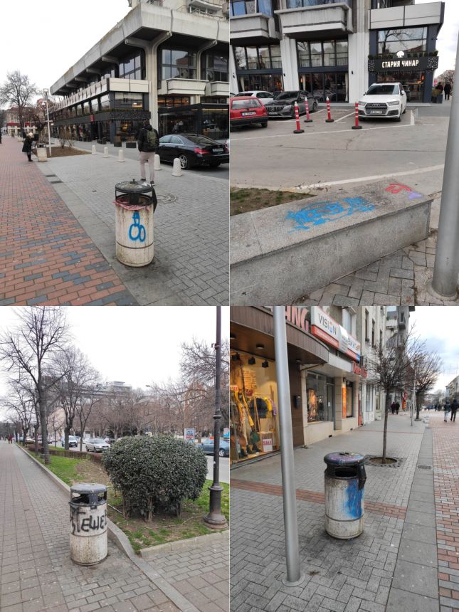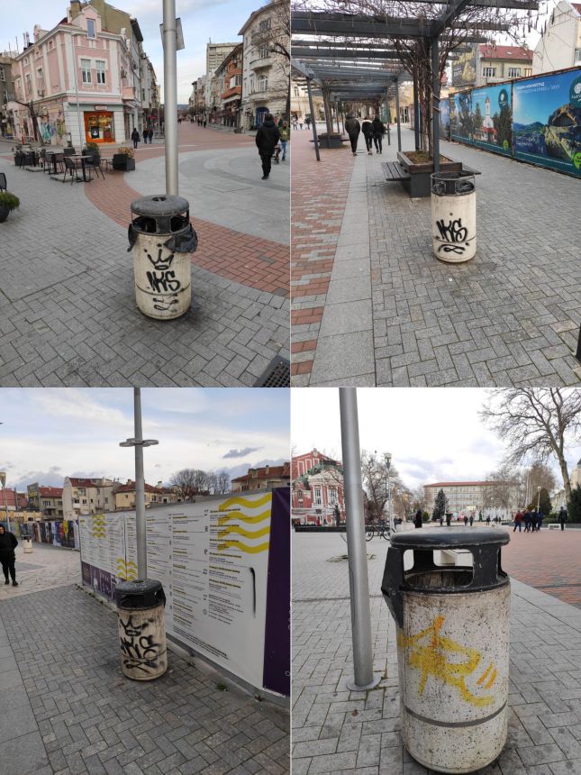 Кошчетата за боклук, който бяха закупени и поставени преди няма 7 години, са покрити с графити и драсканици, грозно и неестетично е.