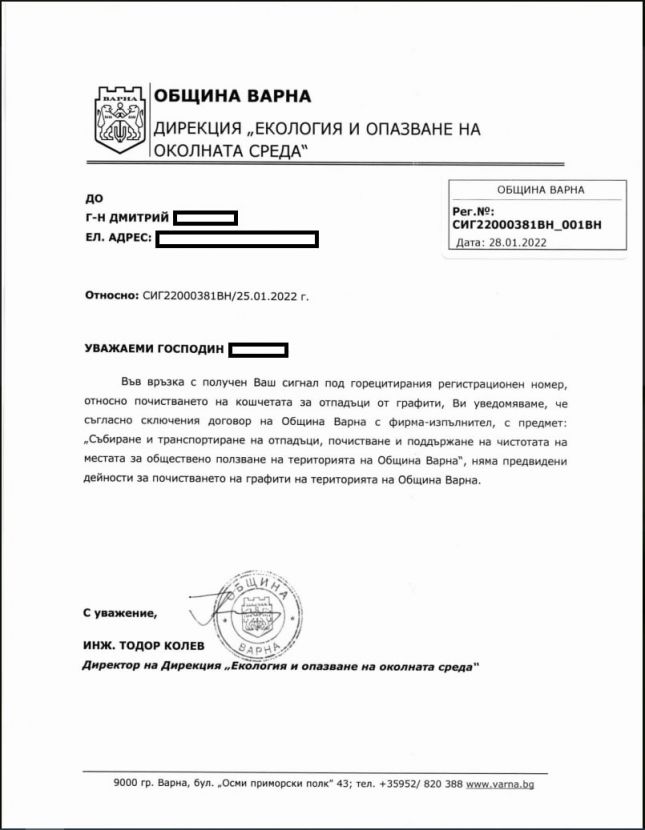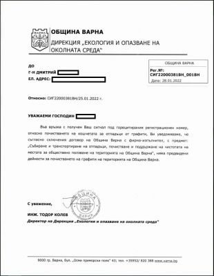 Това е причина Дмитрий Иванов да подаде сигнал до дирекция "Екология и опазване на околната среда" в община Варна. Логично. Едва ли има човек, който да мисли, че нецензурните символи трябва да останат върху тях. Някой може да не е видял, разбрал - имаш гражданска позиция и по административен ред подаваш сигнал.
