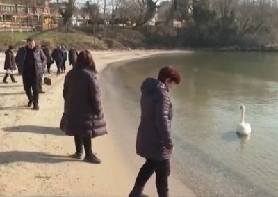 Вторият ден от морската разходка започна със среща с двойка лебеди на плажа в Приморско и песен на "евробабите", както шеговито наричат себе си жените самодейки от читалището в селото.