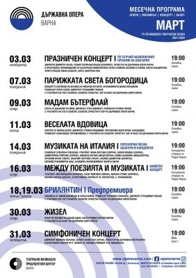 В спектакъла на „Мадам Бътерфлай“ на 9 март 2022 г, постановка на Кузман Попов, под палката на известния диригент от Израел Етан Шмайсер, в ролята на Пинктертон ще аплодираме още един голям тенор - Иван Момиров, варненецът, познат на меломаните в най-добрите оперни театри по света с красивия си тембър и завладяваща емоционалност. Великолепното сопрано Йоана Железчева ще се превъплъти в образа на Мадам Бътерфлай, една от коронните роли в репертоара й. Участват също: Силвия Ангелова – Сузуки, Свилен Николов – Шарплес, Лиляна Кондова - Кейт Пинкертон, Пламен Долапчиев – Горо, Христо Ганевски – Принц Ямадоро, Гео Чобанов – Бонзо и др. Солисти, хор и оркестър на Държавна опера Варна.
