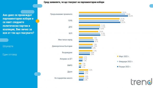 Промени има и при електоралните нагласи. За последните два месеца "Продължаваме промяната" губи 3.5% от подкрепата си сред гласуващите. Формацията около Кирил Петков и Асен Василев продължава да заема първа позиция, но с минимална преднина от 1% пред основния си опонент. ГЕРБ от своя страна стоят статично като подкрепа с 21.9% от гласуващите. ДПС заема трета позиция с 11.4% от заявилите, че ще гласуват на следващи избори, като веднага след нея се нарежда БСП с 10.4% от гласуващите. Следват "Има такъв народ" (7.5% от гласуващите), "Демократична България" (7.4% от гласуващите) и "Възраждане" (7.3% от гласуващите) на пренебрежима дистанция помежду им.