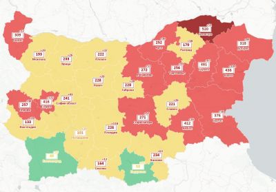 С най-ниски нива са областите Благоевград и Кърджали, като и двете области са в зелена зона. В червена са областите София-град, Перник, Видин, Велико Търново, Ямбол, Търговище, Стара Загора, Шумен, Бургас, Варна и Добрич. Останалите области са в жълта зона.