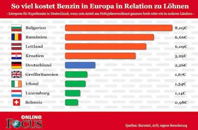 И тук започват сметките на Focus.de. В Германия при средна нетна годишна заплата от 17 839 евро човек трябва да работи около 12 минути, за да изработи за литър бензин. Типичният европеец трябва да работи 18 минути.