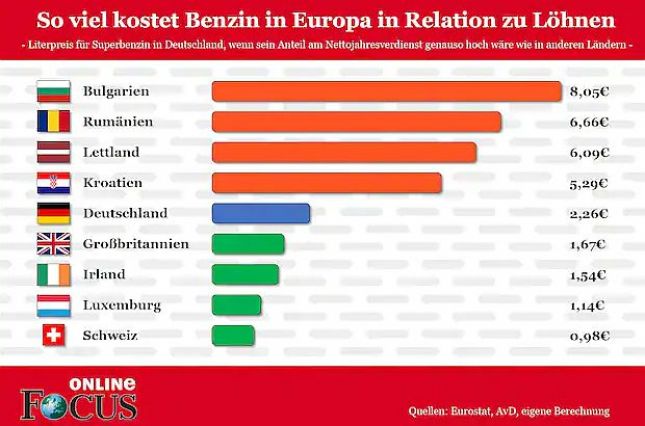 Изданието си поставя следния въпрос: на колко се равнява цената на бензина в други страни спрямо германския стандарт на живот?
