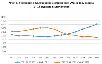Най-висока смъртност през първото тримесечие на 2022 г. е регистрирана през 6-тата седмица (7 февруари - 13 февруари) - 3 569, или 27.3 на 1 000 души от средногодишното население. Най-малко смъртни случаи през първото тримесечие на 2022 г. има през 13-тата седмица - 2 254 лица, или 17.2‰.
