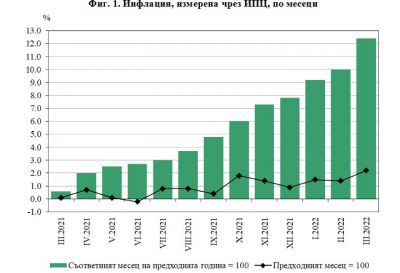 Хармонизираният индекс на потребителските цени за март 2022 г. спрямо февруари 2022 г. е 102.1%, т.е. месечната инфлация е 2.1%. Инфлацията от началото на годината (март 2022 г. спрямо декември 2021 г.) е 4.5%, а годишната инфлация за март 2022 г. спрямо март 2021 г. е 10.5% (табл. 2 от приложението).
