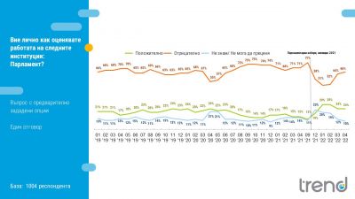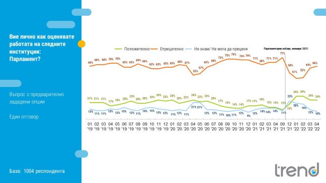 Положителната оценка за работата на парламента се задържа на 24% от всички интервюирани, докато отрицателните оценки се покачват до 66%.