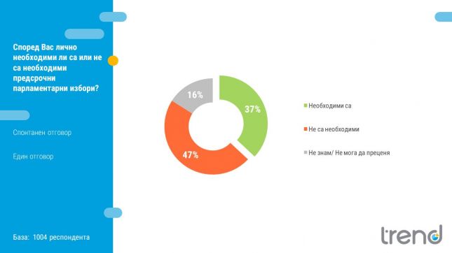 Близо половината българи (47%) са на мнение, че предсрочни парламентарни избори не сa необходими. 37% са на обратното мнение. Сред разбивките по групи прави впечатление, че единствено сред симпатизантите на ГЕРБ и Възраждане доминира позицията, че са необходими предсрочни парламентарни избори.