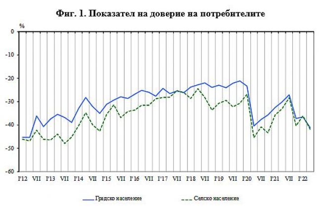 Общият показател на доверие на потребителите намалява с 4.9 пункта спрямо равнището си от преди три месеца, което се дължи на пониженото доверие сред населението както в селата, така и в градовете - съответно с 5.7 и 4.6 пункта