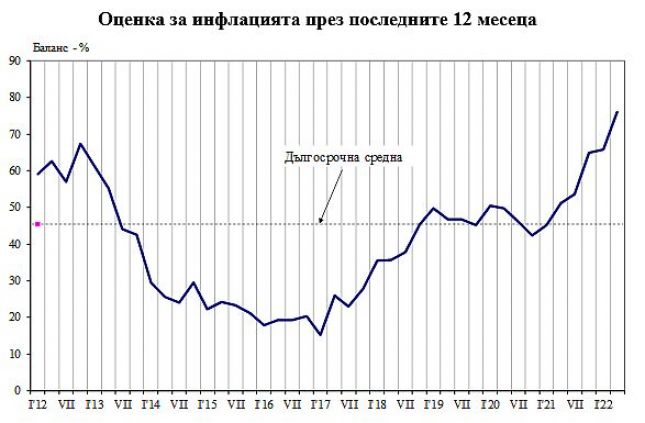 Същевременно и инфлационните им очаквания за следващите дванадесет месеца се засилват (повишение на балансовия показател с 4.9 пункта) .