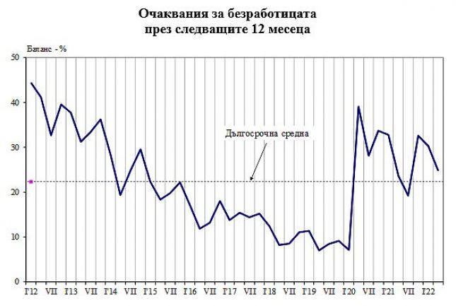 По отношение на безработицата в страната през следващите дванадесет месеца прогнозите се изместват към по-умерените мнения, в резултат на което балансовият показател се понижава с 5.4 пункта.