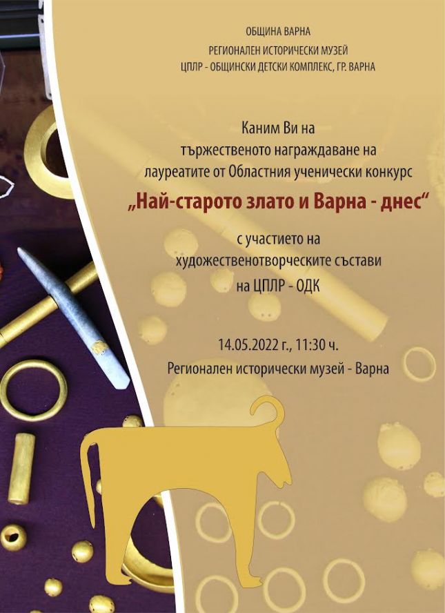 Официалната церемония по награждаване на отличените ученици ще се състои на 14.05.2022 г. от 11:30 ч. в сградата на Археологически музей – Варна. В съпътстващата музикално-артистична програма участие ще вземат възпитаници на ДХ „Добри Христов“, ДВА „Сребърни звънчета“, ВА „Звездни струни“ и НХ „Българче“. По време на церемонията ще бъде представен и тематичен брой на вестник „НахОДКи“, безплатно периодично издание на ЦПЛР – ОДК, гр. Варна, посветен изцяло на 50-годишнината от откриването на Халколитния некропол.