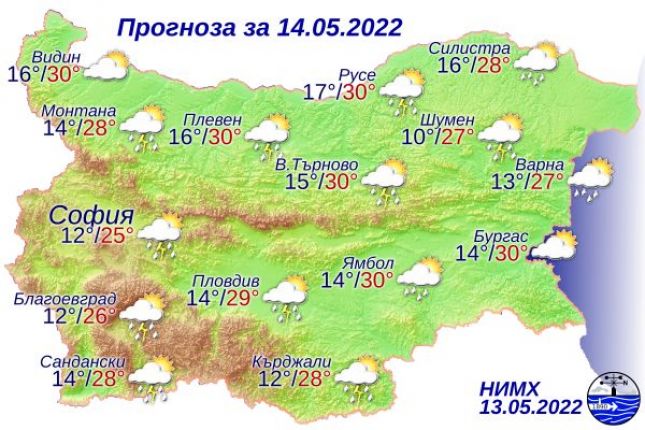 Утре през страната ще премине студен атмосферен фронт. Още преди обяд вятърът ще се ориентира от северозапад, в Източна България - от североизток и с него ще започне да прониква хладен въздух. Въздушната маса ще е неустойчива, ще се развива купеста и купесто-дъждовна облачност. На много места от северозапад на югоизток ще превали краткотраен дъжд с гръмотевици. По приземната линията на фронта ще има локални интензивни валежи, градушки и временно усилване на вятъра. Дневните температури слабо ще се понижат и преобладаващите максимални ще бъдат 25° и 30°, в София около 25°.