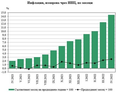 Хармонизираният индекс на потребителските цени за април 2022 г. спрямо март 2022 г. е 102.1%, т.е. месечната инфлация е 2.1%. Инфлацията от началото на годината (април 2022 г. спрямо декември 2021 г.) е 6.8%, а годишната инфлация за април 2022 г. спрямо април 2021 г. е 12.1% .