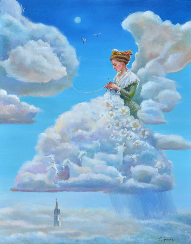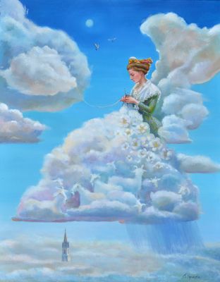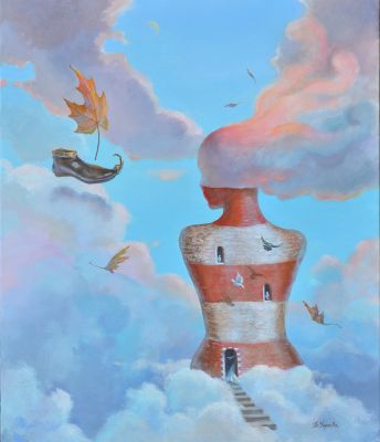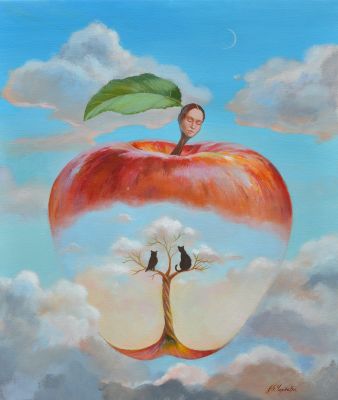В картината „Начало“ жената е изобразена във формата на ябълка- символът на изкушението. Те е тази, която създава дома, изпълва го със светлина и топлота и винаги бди над близките си.