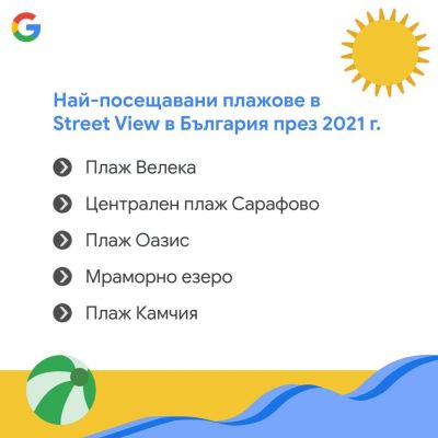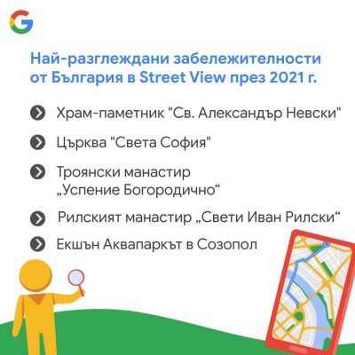 На 15-ия рожден ден на услугата Street View Google споделя данни за най-посещаваните и най-атрактивни локации по света, които потребителите са търсили през изминалата година, сред които се нареждат и български забележителности и туристически дестинации.