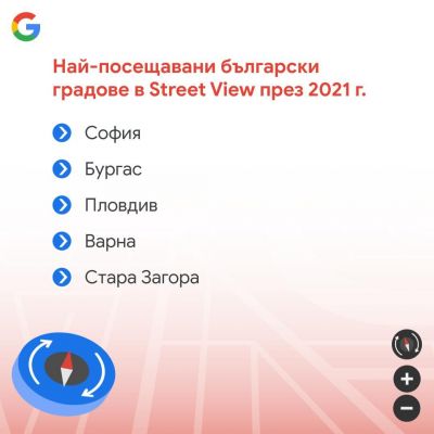 България е класирана на 46-то място сред най-посещаваните страни в Google Street View през 2021 г., точно между Шри Ланка и Южна Корея. Класацията се оглавява от Индонезия, САЩ и Япония, следвани от Мексико и Бразилия на съответно 4-то и 5-то място. Последните позиции в Топ 100 се заемат от Узбекистан (98), Лаоската народнодемократична република, като една от най-желаните дестинации за почивка от българите – Малдивите – се нарежда на 100-то място.