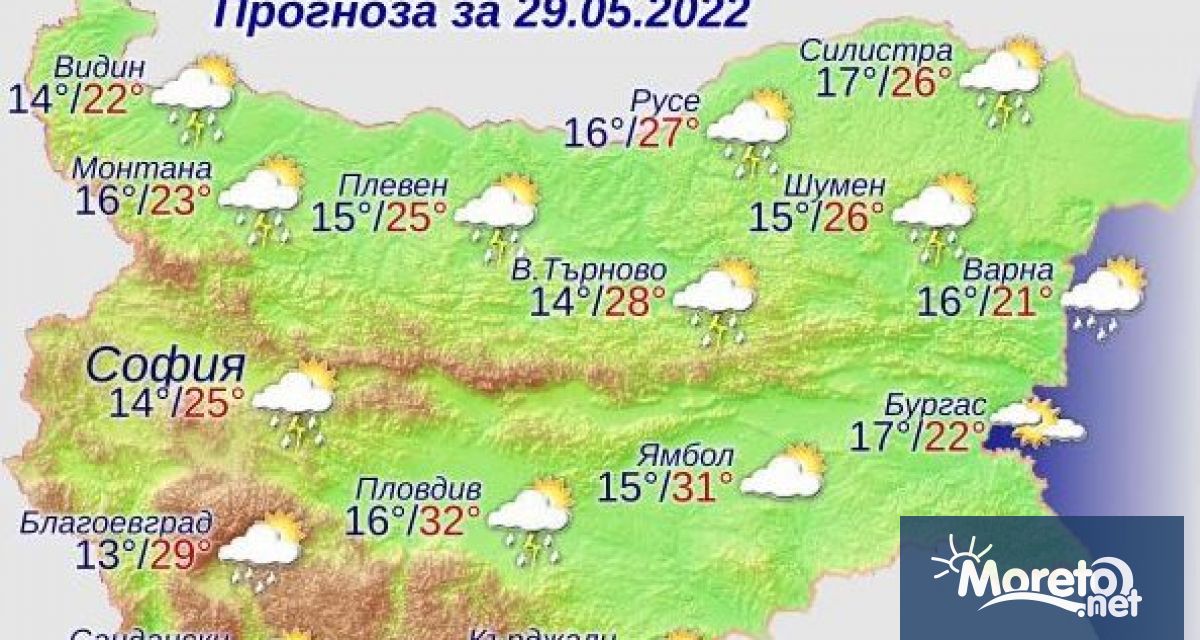 През нощта на места в страната ще има краткотрайни валежи и гръмотевици, по-значителни в Северозападна и Централна Северна България. След полунощ в повечето места явленията временно ще затихнат. Утре главно над Западна и Северна България ще се развива купесто-дъждовна облачност и на много места там ще има краткотрайни валежи, локално интензивни и значителни по количество и с гръмотевични бури и градушки. Вятърът от югоизток ще се усили, но през нощта срещу понеделник ще отслабне и ще се ориентира от запад-северозапад. Максималните температури ще бъдат в широки граници – от 22° в крайните северозападни райони до 32° на места в Южна България, в София около 25°.