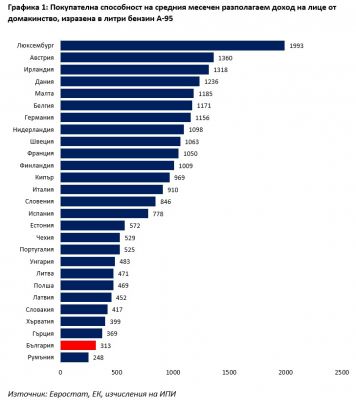 Разликите са значителни – от 248 литра в Румъния до 1993 литра в Люксембург, като България е на предпоследно място с 313. В горната част на класирането са страни като Австрия и Ирландия, които съчетават относително високи доходи и ниски цени на горивата в сравнение с останалите европейски държави. Прави впечатление и, че съседна Гърция е относително близо до България по покупателна способност, изразена в гориво, следствие най-вече на много високата средна цена на бензина в страната.