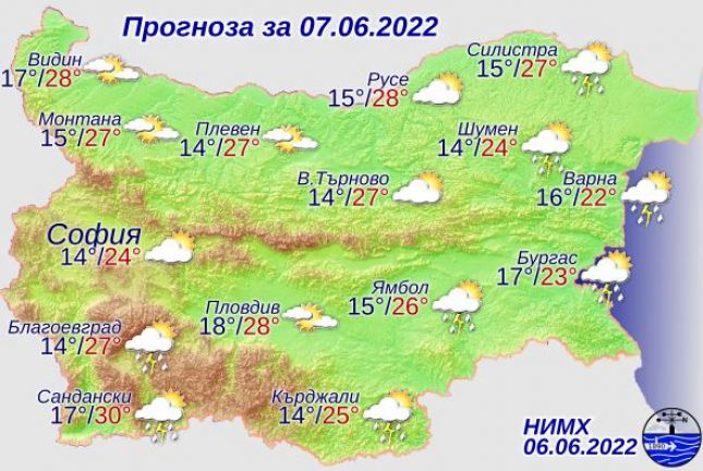 До полунощ явленията навсякъде ще затихнат, а купестата облачност ще се размие. Утре ще преобладава слънчево време. Следобед, главно над Източна България и планинските райони ще се развие купеста и купесто-дъждовна облачност и на отделни места ще превали краткотраен дъжд с гръмотевици. Ще продължи да духа слаб, в източните райони до умерен североизточен вятър. Максималните температури ще бъдат между 24° и 29°, в София около 24°.