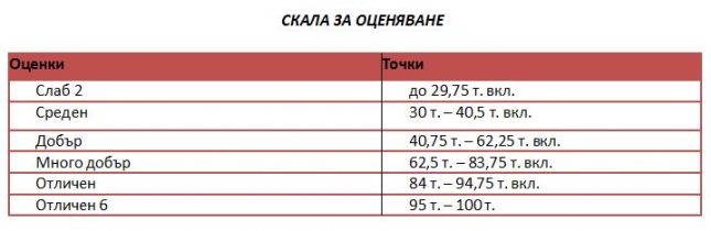 Например, ако зрелостник има 42 точки на теста по физика и астрономия, то резултатът му ще бъде изчислен, като 42 се раздели на 60 (това е максималният брой точки по този предмет) и се умножи по 100. Така крайният резултат от държавния зрелостен изпит ще бъде 70 точки. Те се превръщат в крайна оценка по вече обявената скала – в случая много добър 4,85.