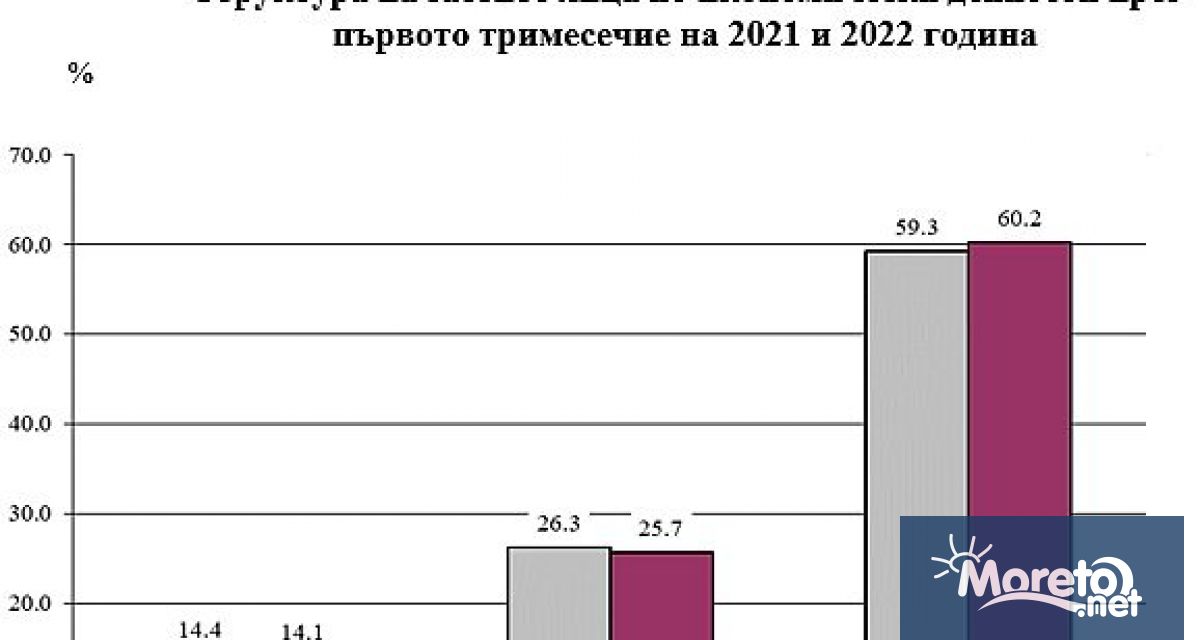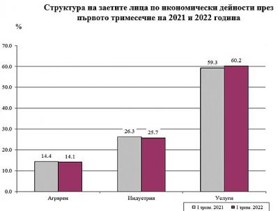 Структурата на заетостта по икономически сектори през първото тримесечие на 2022 г. спрямо съответното тримесечие на 2021 г. показва увеличение на относителния дял в сектора на услугите и намаление на относителния дял в аграрния и индустриалния сектор.