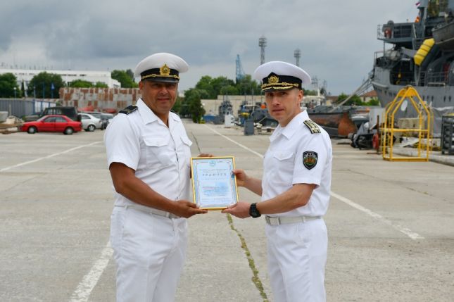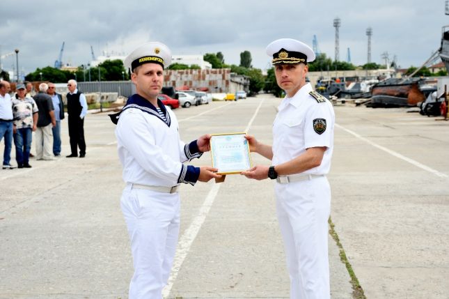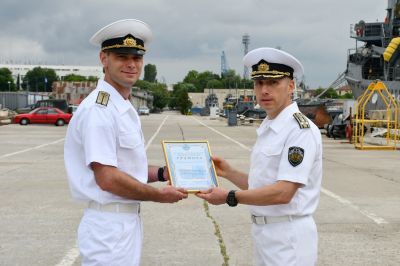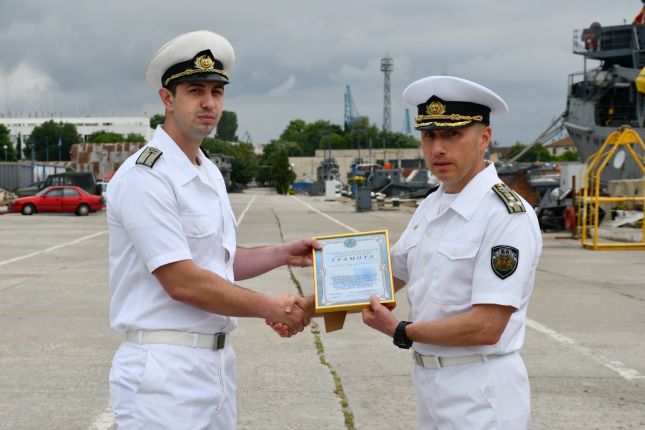 Командирът на дивизиона капитан I ранг Даниел Тодоров връчи удостоверения за допускане до самостоятелно управление на кораб на капитан-лейтенант Георги Мирчев, помощник-командир на учебно-спомагателен кораб „Капитан I ранг Димитър Добрев”, и лейтенант Ясен Златанов, командир на танкер-бункеровчик „Балчик”.