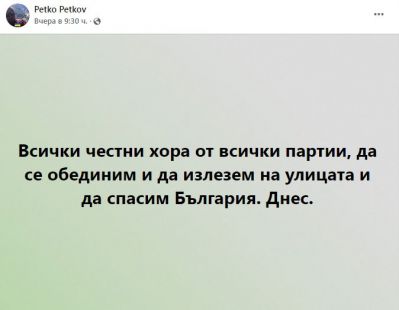 "Всички честни хора, от всички партии да се обединим и да излезем на улицата и да спасим България. Днес.", написа той вчера, 10 юни, в профила си в социалната мрежа.