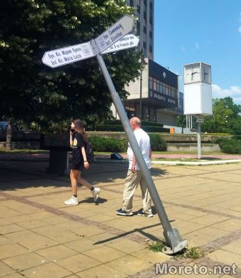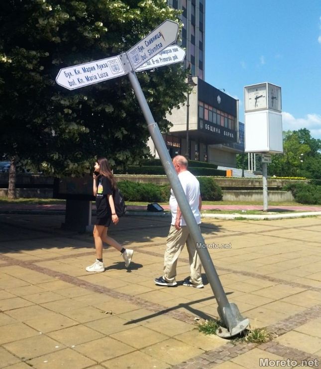 Силно наклонен стълб с указателни табели застрашава минувачи в района на спирката край Община Варна, видя репортер на Moreto.net