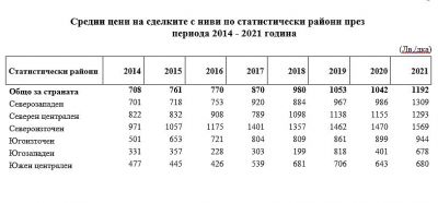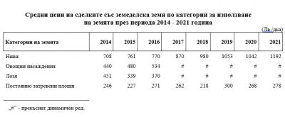 Средната цена на сделките между физически и юридически лица достига 1 184 лв. за декар, а на сделките между юридически лица - 1 133 лева. Средната цена на сделките с постоянно затревени площи (естествени и изкуствени ливади, мери и пасища) през 2021 г. достига 278 лв. за един декар и също отбелязва увеличение спрямо предходната година - с 3.9%