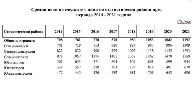 През 2021 г. средната цена на сделките с ниви в България достига 1 192 лв. за един декар, което е с 14.4% повече в сравнение с 2020 година. Преди 7 години средната цена на сделки с ниви е била 708 лв., припомня Moreto.net