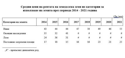 През 2021 г. средната цена за наем/аренда на един декар ниви достига 55 лв., което е с 20.5% повече спрямо 2020 година. Средната цена за наем/аренда на един декар постоянно затревени площи е 25 лв. и е с 19.4% повече спрямо предходната година.