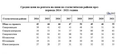 Цената, платена за наем/аренда на един декар ниви, отбелязва повишение спрямо предходната година и в шестте статистически района. В Северозападния и Северния централен район повишението е с 10.1%, в Североизточния район - с 51.3%, в Югоизточния район - с 16.4%, в Югозападния район - с 6.1%, и в Южния централен район - с 8.4%. През 2021 г. най-висока е средната цена за наем/аренда на един декар ниви в Североизточния район - 82 лв., а най-ниска - в Югозападния район - 32 лв.