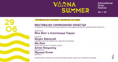 Изключително мащабен концерт ще привлече публиката на 29 юни от 19:30 в Зала 1 на Фестивалния и конгресен център с посвещението си на мира. Участва Фестивален оркестър, съставен от музиканти от 16 страни и представители на водещи български симфонични оркестри, както и двама диригенти – маестро Жин Ванг и Александър Гордън. Солисти са Шмуел Барзилай – главен кантор на еврейската общност във Виена, Антон Никулеску – виолончело, и Жулиде Ялчин - цигулка. Уникално ще е типично фестивалното съчетание на водещи оркестранти от България, Украйна, Румъния, Австрия, Словакия, Сърбия, Турция, Македония, Испания, Финландия, Молдова, Франция, Италия, Латвия, Литва, Израел, Великобритания и Китай, които в обединено послание ще свирят на „Варненско лято”. Ще прозвучат симфонични творби и аранжименти на източноправославна, будистка и еврейска тематика от композиторите Веселин Стоянов, Макс Брух, Жин Ванг, Роксана Пануфник. В изпълнение на Жулиде Ялчин меломаните ще чуят и популярната българска пиеса „Севдана” от Георги Златев-Черкин. Ще бъде включена и нова творба от известният украински композитор Александър Родин, със световна премиера на ММФ „Варненско лято“.