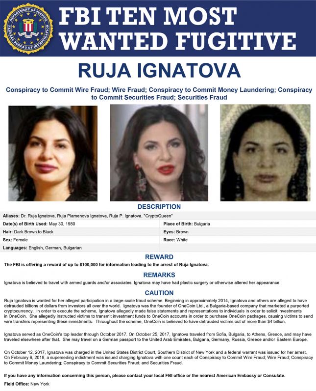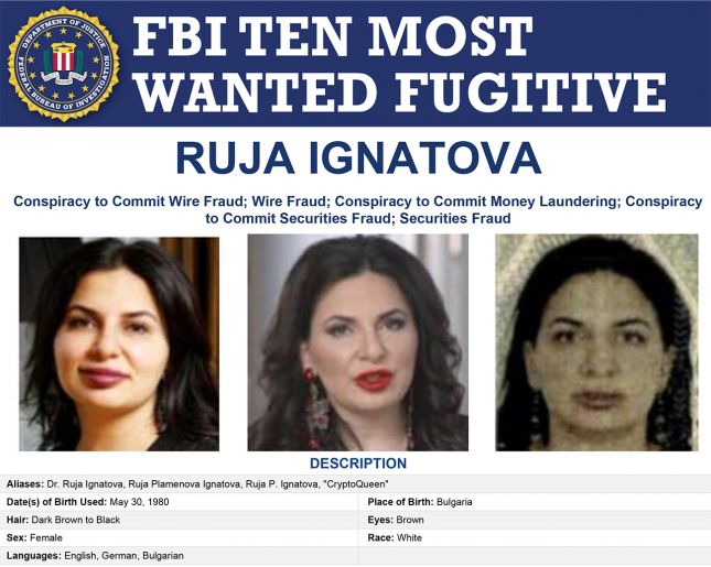 ФБР обяви добавянето на Ружа Игнатова към своя списък с десетте най-издирвани бегълци. Игнатова е издирвана заради предполагаемото ѝ ръководство на мащабна схема за измама, която засегна милиони инвеститори по целия свят. ФБР предлага награда до 100 000 долара за информация, която ще доведе до нейното арестуване.