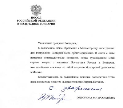 За съжаление, нашето обръщане към Министерството на външните работи на Република България беше игнорирано. Във връзка с това възнамерявам безотлагателно да повдигна пред ръководството на моята страна въпроса за закриването на Посолството на Русия в България, което неизбежно ще доведе до закриване на българската дипломатическа мисия в Москва.