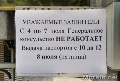 Официално съобщение, поставено на входа, гласи, че вземането на паспорти ще е от 10.00 до 12.00 часа на 8 юли.